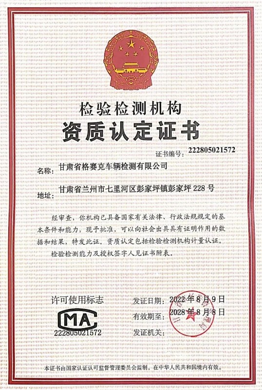 近日,裝備公司子公司甘肅省格賽克車輛檢測有限公司順利取得甘肅省市場監(jiān)督管理局頒發(fā)的檢驗檢測機構(gòu)資質(zhì)認(rèn)定(CMA)換證復(fù)核資質(zhì)證書,確保了各項車檢業(yè)務(wù)的順利開展。